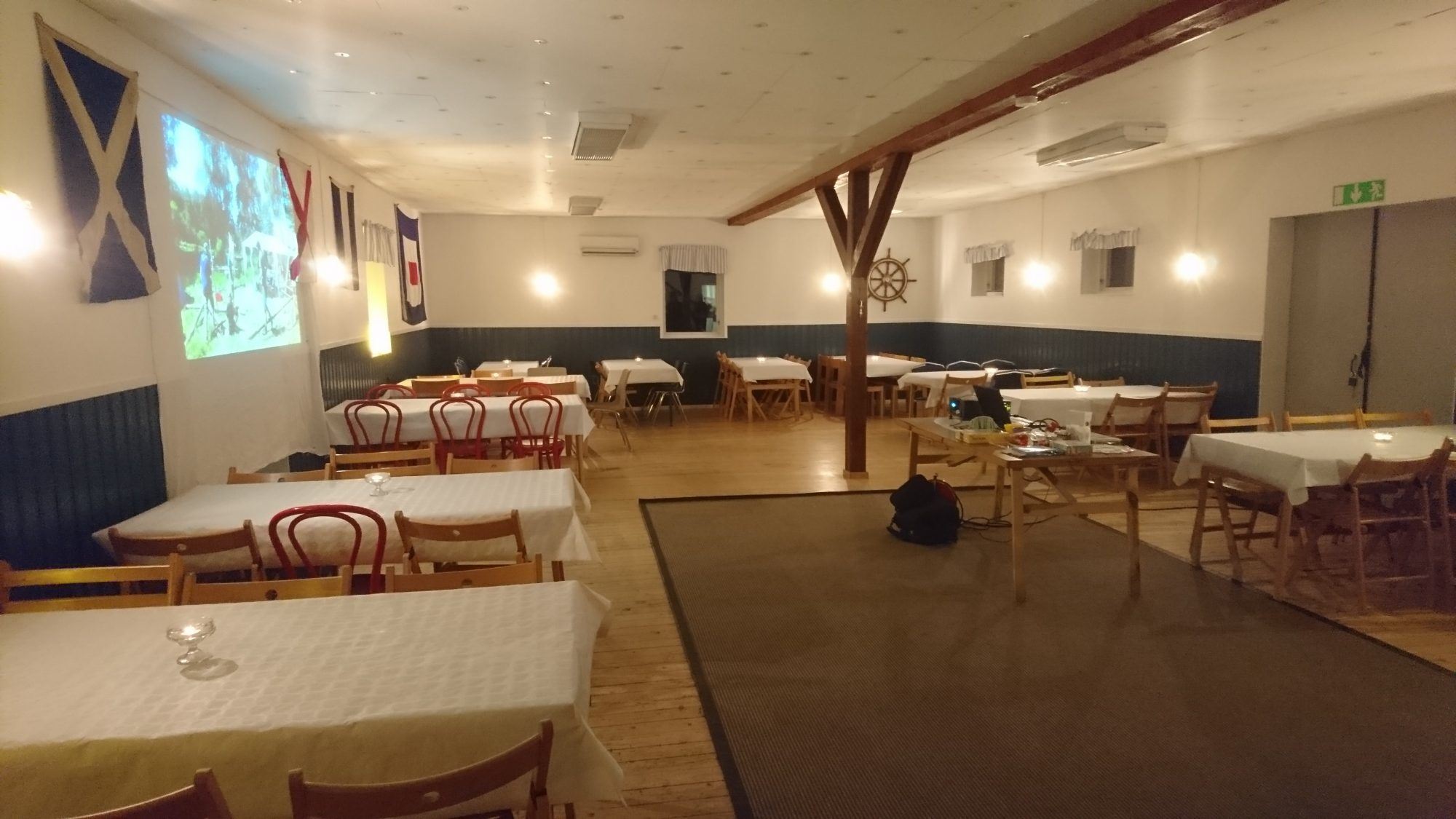 Tables, chairs, glasses, wine glasses, crockery and more for 60 people. In the large hall, you can all stay seated at the same time. The kitchen also has a very fast industrial dishwasher (under 10 minutes per dish), cooker, microwave, coffee and kettle, two refrigerators, freezer.