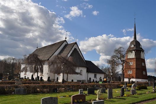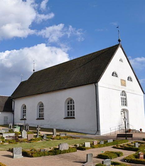 The Swedes burned it down during the Nordic Seven-Year War, and it was abandoned for 100 years. A sacristy was added in 1714, and the nave was lengthened under the reign of King Gustav III. The church is in white stucco and has no tower. A three-bell bell tower from 1749 stands beside it. Inside, the canopied baptismal font is made of carved oak (created by Åke Truedsson in Jämshög, who probably also carved the pulpit and the sepulchral tablet in memoriam of Andreas Bager and his two wives). Bager was the first priest to serve after the church became Swedish. The altar contains a crucifix carved in 1964 by Nils Sandberg in Rödeby.