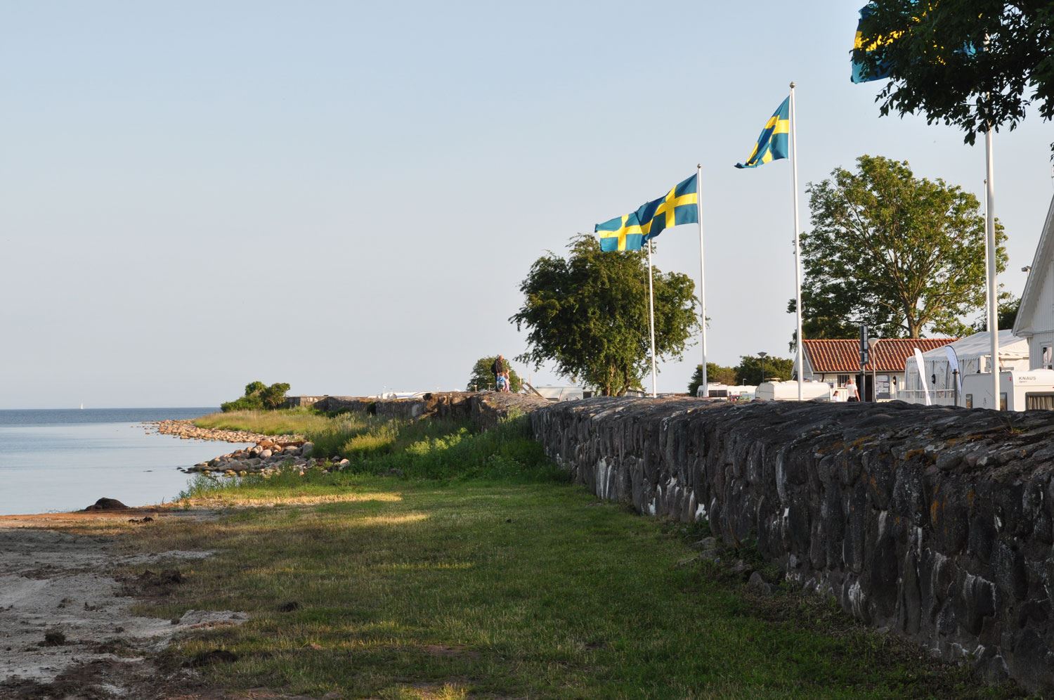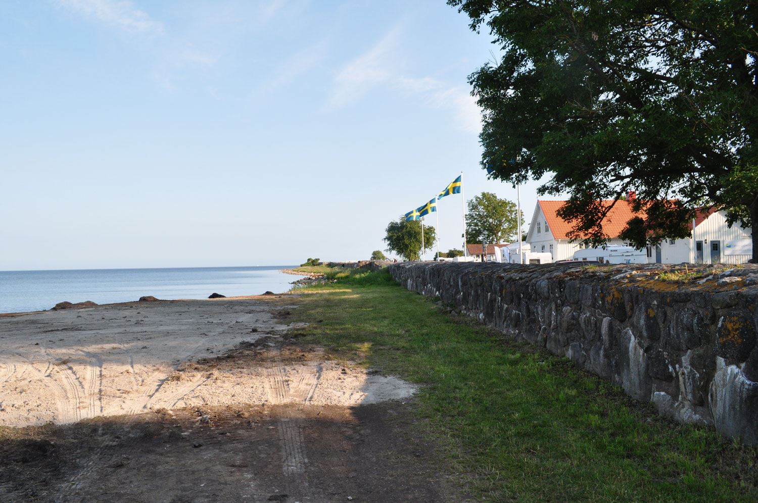 I viken finns den större badplatsen med två mindre badbryggor i trä och en större i cement. Här finns också en större strand för de små och gräsområden för lek och spel. Insidan har inte lika klart vatten men här är det varmare och med badbryggorna så passar det bättre för de lite mindre. Här finns gott om plats att bygga många sandslott!