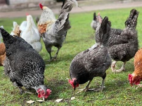 Ta en paus och avnjut kaffe och glass i härlig miljö där hönsen springer fritt omkring.