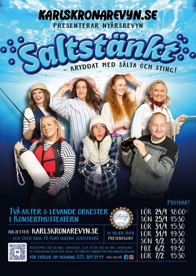 Karlskronarevyn.se sätter upp nyårsrevyn Saltstänkt i Karlskrona Konserthusteater under sju tillfällen i januari och februari.