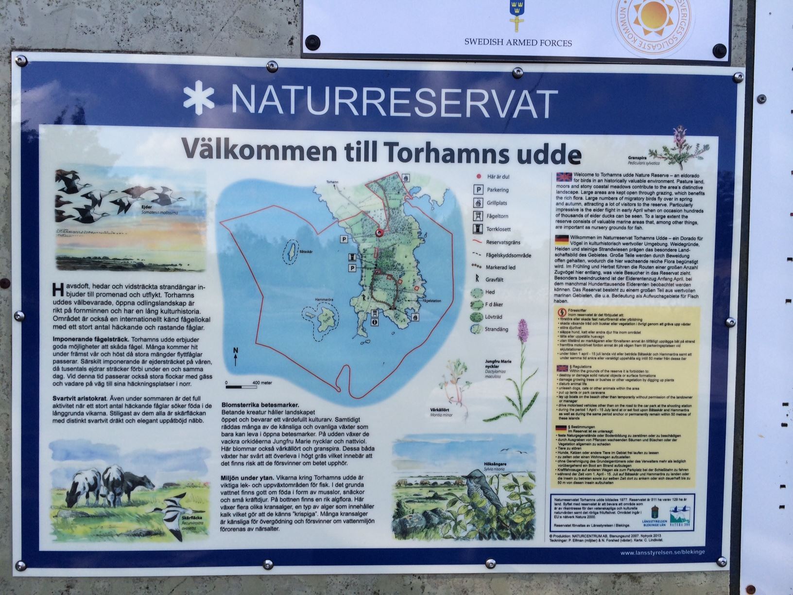 Torhamns uddes välbevarade, öppna odlingslandskap är rikt på fornminnen och har en lång kulturhistoria. Området är också en internationellt känd fågellokal med ett stort antal häckande och rastande fåglar. Torhamns udde är ett välbesökt utflyktsmål. Många kommer hit för att skåda fågel, främst under vår och höst då stora mängder flyttfåglar passerar. Läs mer på Länsstyrelsens eller Karlskrona ornitologiska klubbs sida.